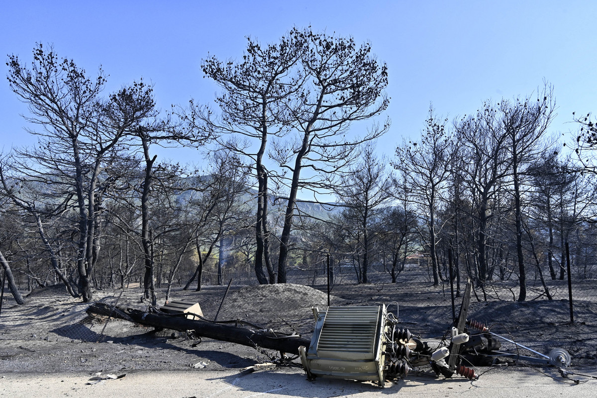 Καμμένος πυλώνας της ΔΕΗ σε οικισμό του Λουτρακίου, Τρίτη 18 Ιουλίου 2023. Νέες αναζωπυρώσεις, στις περιοχές του Αγίου Χαραλάμπους και του Πανοράματος, Λουτρακίου, αντιμετωπίζουν οι ισχυρές εναέριες και επίγειες δυνάμεις πυρόσβεσης. Λόγω των ισχυρών ανέμων που πνέουν στην περιοχή, οι εστίες της φωτιάς παίρνουν διαστάσεις, με αποτέλεσμα να φθάνουν κοντά σε κατοικημένες περιοχές, ενώ οι πυροσβεστικές δυνάμεις προσπαθούν συνεχώς να κρατήσουν τις φλόγες μακριά από τα σπίτια. Οι κάτοικοι προσπαθούν να γλιτώσουν τόσο οι ίδιοι όσο και τα ζώα τους. ΑΠΕ-ΜΠΕ/ΑΠΕ-ΜΠΕ/ΒΑΣΙΛΗΣ ΨΩΜΑΣ