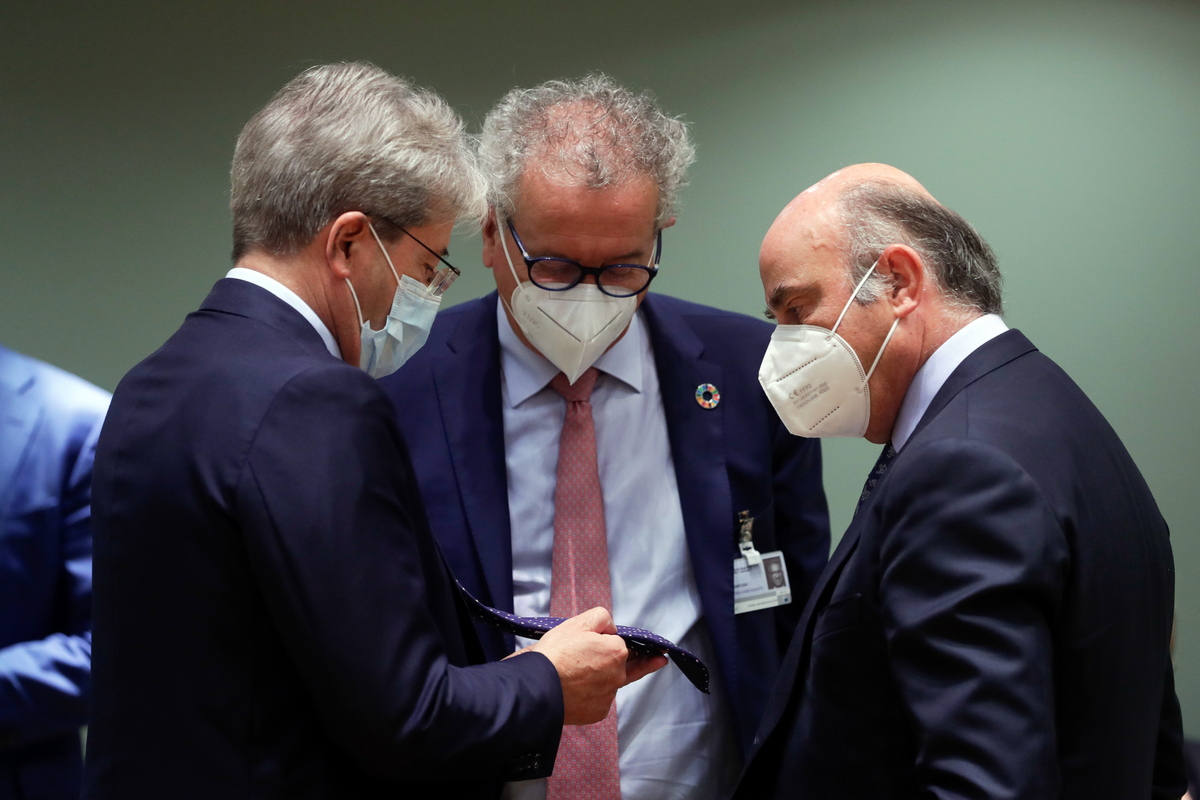 epa09341395 European Commissioner for Economy Paolo Gentiloni (L), Luxembourg's Minister of Finance Pierre Gramegna and ECB Vice President Luis de Guindos (R) attend an Economic and Financial Affairs Council (ECOFIN) of Finance Ministers' meeting, at the European Council in Brussels, Belgium, 13 July 2021. Ministers will focus their work on economic recovery. They will exchange views on the implementation of the Recovery and Resilience Facility and adopt the first set of Council Implementing Decisions on Member States' Recovery and Resilience Plans. EPA/STEPHANIE LECOCQ