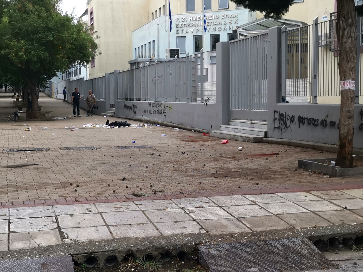 Πεταμένα αντικείμενα έξω από το ΕΠΑΛ Σταυρούπολης στη Θεσσαλονίκη, την Τετάρτη 29 Σεπτεμβρίου 2021. Επεισόδια έλαβαν χώρα το πρωί στο ΕΠΑΛ Σταυρούπολης όταν ομάδα ατόμων με κουκούλες και καλυμμένα τα πρόσωπα βγήκε στην αυλή του σχολείου, εκτοξεύοντας πέτρες, κροτίδες, μπουκάλια και άλλα αντικείμενα στη μεριά φοιτητικών και άλλων συλλόγων που είχαν συγκεντρωθεί έξω από το σχολείο για να διαμαρτυρηθούν για τα χθεσινά γεγονότα. Το πρωί οι καθηγητές του ΕΠΑΛ έλεγχαν στην είσοδο του σχολείου αν είναι μαθητές όσοι εισέρχονταν και παραμένει αδιευκρίνιστο αν τα άτομα που χρησιμοποίησαν το σχολείο ως ορμητήριο για την επίθεση ήταν μαθητές που βγήκαν από τις τάξεις ή εξωσχολικοί που βρήκαν τρόπο να μπουν μέσα στην αυλή. Η αστυνομία έκανε χρήση περιορισμένη χρήση χημικών προκειμένου να απομακρύνει τους συγκεντρωμένους.ΑΠΕ-ΜΠΕ/ΑΠΕ-ΜΠΕ/STR