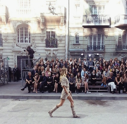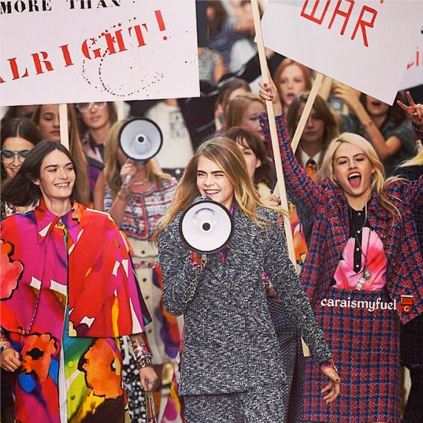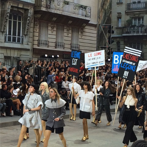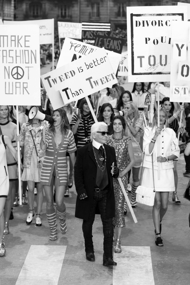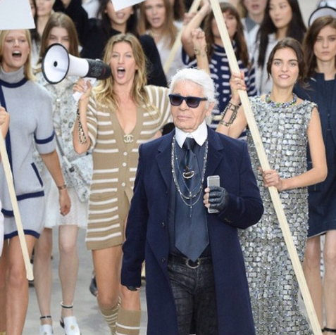 Ο Karl Lagerfeld εμπνευσμένος από τα επαναστατικά ντοκιμαντέρ Zeitgeist, αλλά και την παγκόσμια κρίση, μετέτρεψε την επίδειξη μόδας για την Άνοιξη/Καλοκαίρι 2015 σε μια πολύχρωμη διαδήλωση. Τα διάσημα μοντέλα και οι μούσες του Gisele Bündchen και Cara Delevingne, εμφανίστηκαν με μεγάφωνα και πλακάντ με επίκαιρα συνθήματα κατά του ρατσισμού και μηνύματα υπέρ της γυναίκας και υπέρ των δικαιωμάτων των ομοφυλόφιλων. Εξέφρασε, με χιούμορ, την αντίθεση του στον συντηρητισμό, προτείνοντας μια διέξοδο μέσω της μόδας, με τη χαρακτηριστική φράση “Make Fashion Not War”. Στην Εβδομάδα Μόδας του Παρισιού, ο Karl, για ακόμα μια φορά πρωτοτύπησε, δημιουργώντας το πιο αντιδραστικό και εκκεντρικό fashion show, αφιερωμένο στην σημασία της απλότητας της καθημερινότητας. O σχεδιαστής εμπνευσμένος από τα ’70s, μας παρουσίασε ριγέ σόρτς συνδυασμένα με λευκά πουκάμισα με vintage κολάρα, τύπου πίτερ πάν, μακρυά και βαριά παλτό με εντυπωσιακά prints, ενώ συνδύασε το σκούρο πράσινο και το απαλό ρoζ σε εντυπωσιακά suede deux pieces. Σημαντική αναφορά στα 70’s ήταν τα κοντά, νεανικά φορέματα, φτιαγμένα από ανάγλυφα μεταλλικά τουβλάκια.