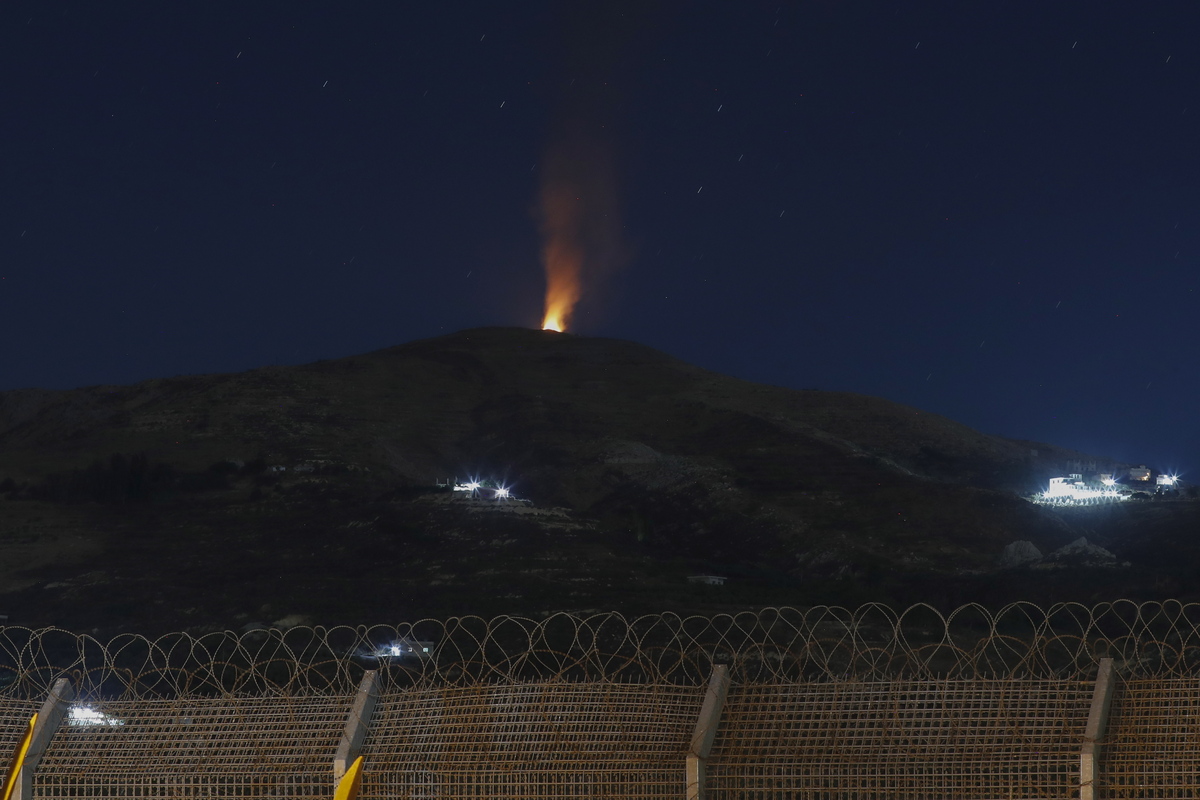 epa09418326 A long exposure picture taken from the Druze village of Majdal Shams in the annexed Golan Heights shows flames rising from the Syrian side of the border after an alleged strike, 17 August 2021. Syrian official media sources said Israel targeted an army post near the Quneitra province with missiles. Israeli army did not comment on the incident. EPA/ATEF SAFADI
