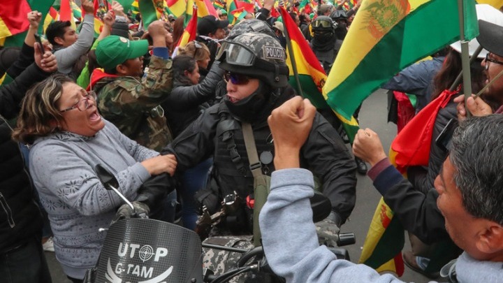 Ταραχές ξέσπασαν τη νύχτα της Κυριακής προς Δευτέρα τόσο στη Λα Πας όσο και στην Ελ Άλτο, κοντά στην πρωτεύουσα της Βολιβίας, μετά την παραίτηση του Έβο Μοράλες από την προεδρία της χώρας της Λατινικής Αμερικής. Λεωφορεία πυρπολήθηκαν, ενώ κατοικίες προσωπικοτήτων υπέστησαν εμπρησμούς ή λεηλατήθηκαν, μετέδωσαν βολιβιανά ΜΜΕ. Στη Λα Πας, δεκάδες διαδηλωτές «μπήκαν στις εγκαταστάσεις μας κι άρχισαν να καίνε λεωφορεία», ανέφερε μέσω Twitter ο δημοτικός φορέας των συγκοινωνιών στη Λα Πας. Μέσα ενημέρωσης μετέδωσαν στιγμιότυπα στα οποία εικονίζονται τουλάχιστον δεκαπέντε λεωφορεία στις φλόγες σε αμαξοστάσιο λεωφορείων. Eκδοθεί ένταλμα σύλληψης του Έβο Μοράλες, διαβεβαιώνει ο αρχηγός της αστυνομίας