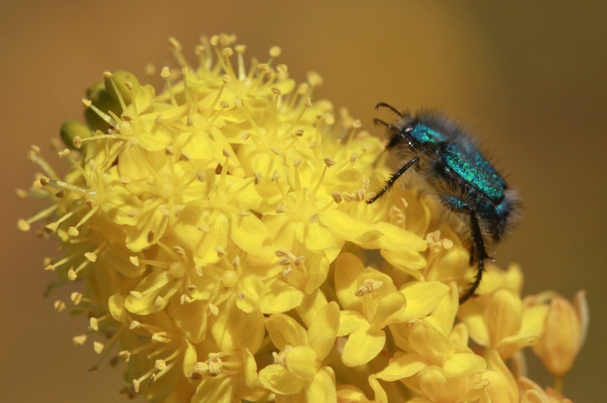 epa02292498 A Blue Monkey beatle crawls on a Yellow Bulbinella flower in the Namaqualand plains of Nieuwoudtville, Northern Cape, South Africa, 17 August 2010. The Namaqualand spring flowers are world famous. Namaqualand is a semi-desert environment, however in the spring (July to September) depending on the rains which soak into the earth, millions upon millions of flowers emerge in a phenomenal explosion of colour unrivaled anywhere on earth. EPA/NIC BOTHMA