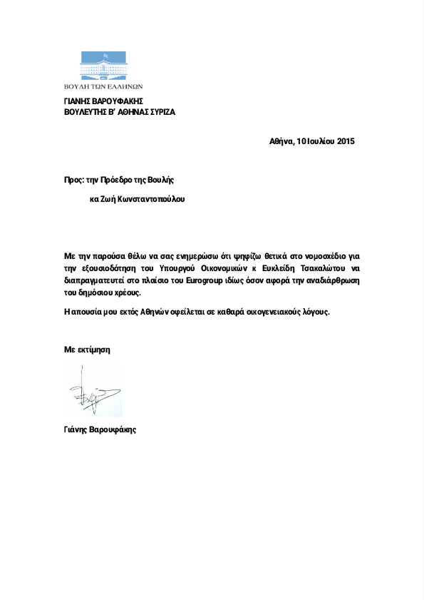 Ο πρώην Υπουργός Οικονομικών, Γιάνης Βαρουφάκης, ενημέρωσε μέσω Twitter ότι θα ψηφίσει θετικά με επιστολική ψήφο στο νομοσχέδιο για την εξουσιοδότηση του Υπουργού Οικονομικών, κ. Ευκλείδη Τσακαλώτου, να διαπραγματευτεί την επίτευξη συμφωνίας στο Eurogroup. Υπενθυμίζεται ότι ο κ. Βαρουφάκης έχει ήδη ενημερώσει ότι θα απέχει από την αποψινή ψηφοφορία για «οικογενειακούς λόγους».