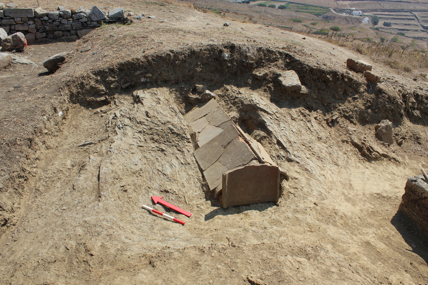 Το νεκροταφείο αναπτύσσεται σε δύο διαδοχικά άνδηρα του λόφου εκατέρωθεν ταφικής οδού που οδηγούσε στον οικισμό. Οι τάφοι που έχουν αποκαλυφθεί έως τώρα στο κάτω άνδηρο είναι κυρίως κεραμοσκεπείς. Yπάρχουν και κιβωτιόσχημοι, καθώς και δύο σαρκοφάγοι (μία πήλινη και μία λίθινη) και αρκετοί εγχυτρισμοί (κυρίως νηπίων). Ανάμεσα στους τάφους υπήρχαν εναγιστικές πυρές. Οι νεκροί ήταν ενταφιασμένοι με λίγα κτερίσματα, συνήθως αγγεία εισηγμένα από την Αττική. Η σήμανση των τάφων σε αυτό το άνδηρο γινόταν με απλούς ανεπεξέργαστους λίθους. Αντίθετα, στο άνω άνδηρο υπήρχε κατά μήκος της ταφικής οδού μια σειρά κτιστών, πολυτελών κατασκευών διαφόρων τύπων για τη στήριξη ταφικών μνημείων. Ένας μικρός αριθμός επιτυμβίων στηλών που είχαν βρεθεί παλαιότερα στην περιοχή αποδίδονται στο νεκροταφείο, όμως για πρώτη φορά φέτος βρέθηκε ένας ικανός αριθμός επιτυμβίων στηλών στον χώρο του νεκροταφείου. Όλες βρέθηκαν σε ένα στρώμα καταστροφής του 4ου αι. π.Χ., σπασμένες και πεταμένες, με την κύρια όψη στο έδαφος. Ορισμένες είναι ιδιαίτερα σημαντικές για την ιστορία της τηνιακής γλυπτικής, όπως μία στήλη με ανάγλυφη παράσταση γυμνού νέου από την οποία σώζεται μόνον το κάτω τμήμα και μια άλλη με παράσταση γυμνού γενειοφόρου και πιθανότατα αφηρωϊσμένου άνδρα που συνοδεύεται από μικρό «παίδα» (τον συνήθως ερμηνευόμενο ως δούλο) που κρατά πτηνό. Πρόκειται για έργο εξαίρετου γλύπτη κατασκευασμένη σε τηνιακό μάρμαρο που αποκόπτεται εύκολα σε επίπεδες επιφάνειες («φυλλιάρικο») και ίσως για αυτό το πρόσωπο του ανδρός βρέθηκε λίγο πιο πέρα από τη στήλη.