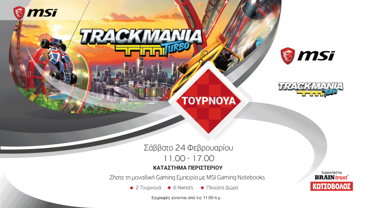 Όλοι οι ενδιαφερόμενοι μπορούν να αναμετρηθούν στο Trackmania Turbo σε δύο διαδοχικά τουρνουά και να διεκδικήσουν δώρα από την MSI. Τα τουρνουά θα πραγματοποιηθούν ως εξής: