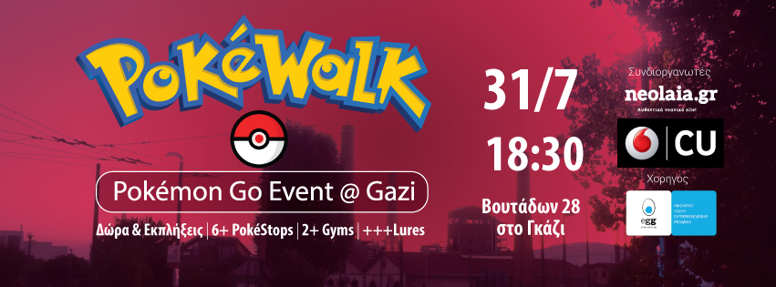 Το neolaia.gr μαζί με το Vodafone CU και την υποστήριξη του EGG, δίνουν ραντεβού την Κυριακή στις 18:30, ξεκινώντας από το σταθμό του μετρό Κεραμεικός στο Γκάζι, έξω από το μαγαζί KUDU “The Workshop” (Βουτάδων 28) για μία βόλτα γεμάτη Pokémon και μάχες, ακολουθώντας τον πεζόδρομο μέχρι το Θησείο!