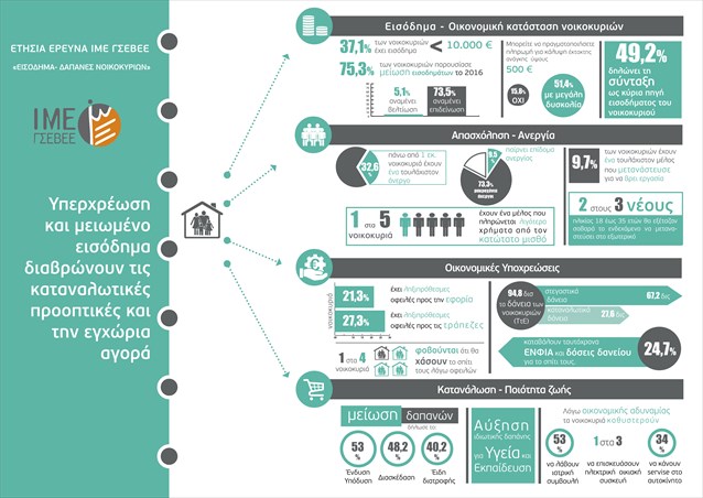 Μείωση εισοδημάτων παρουσίασε το 75,3% των νοικοκυριών το 2016, σε σχέση με το 2015, σύμφωνα με ετήσια έρευνα του Ινστιτούτου Μικρών Επιχειρήσεων της ΓΣΕΒΕΕ. Αποθαρρυντικό είναι το γεγονός ότι οι προσδοκίες των νοικοκυριών για το νέο έτος παραμένουν συντριπτικά αρνητικές, καθώς το 73,5% αναμένει επιδείνωση της οικονομικής του κατάστασης (μόνο το 5,1% αναμένει βελτίωση των οικονομικών του). Παράλληλα, παρατηρείται τάση διεύρυνσης της ανισότητας υπέρ των ανώτερων εισοδηματικών κλιμακίων, καθώς στην κατηγορία των νοικοκυριών με ετήσιο εισόδημα άνω των 30.000 ευρώ παρουσιάζεται αύξηση στο 11,1% του πληθυσμού.