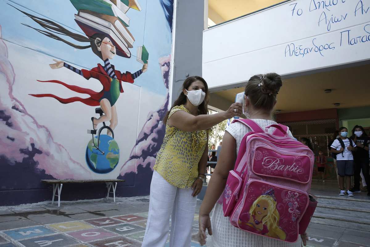 Δασκάλα φορώντας μάσκα πραγματοποιεί θερμομέτρηση σε μαθήτρια του 7ου Δημοτικού σχολείου Αγίων Αναργύρων, Δευτέρα 14 Σεπτεμβρίου 2020. Ένα διαφορετικό «πρώτο κουδούνι» χτυπάει σήμερα στα σχολεία. Η πανδημία του κορονοϊού έφερε νέα δεδομένα και έτσι, το παζλ της λειτουργίας των σχολείων φέτος συνθέτουν κομμάτια από μία μακρά λίστα μέτρων πρόληψης, βασικότερα εκ των οποίων η υποχρεωτική χρήση μάσκας, ο σχολαστικός καθαρισμός χεριών, αιθουσών και εξοπλισμού. ΑΠΕ-ΜΠΕ/ΑΠΕ-ΜΠΕ/ΑΛΕΞΑΝΔΡΟΣ ΒΛΑΧΟΣ