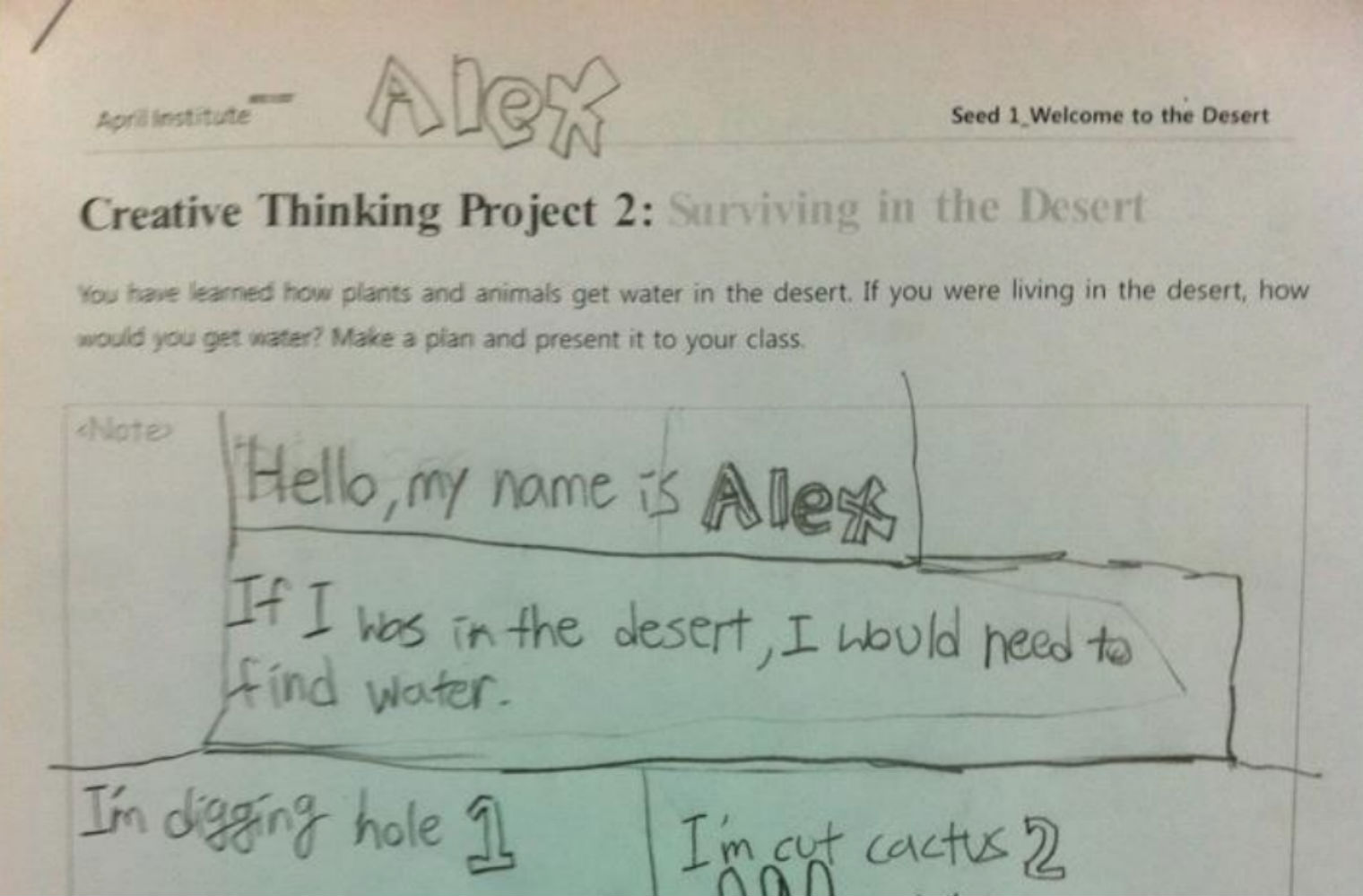 Ο μικρός Άλεξ, παρότι μαθητής του δημοτικού, το ξέρει καλά αυτό. Όταν στο σχολείο του ανέθεσαν μία «εργασία δημιουργικής σκέψης», η οποία του ζητούσε να βρει τρόπους επιβίωσης στην έρημο μέσω της μίμησης μεθόδων επιβίωσης των ζώων, ο πιτσιρικάς μετήλθε κάποιων σχεδόν «επαγγελματικών» λύσεων.