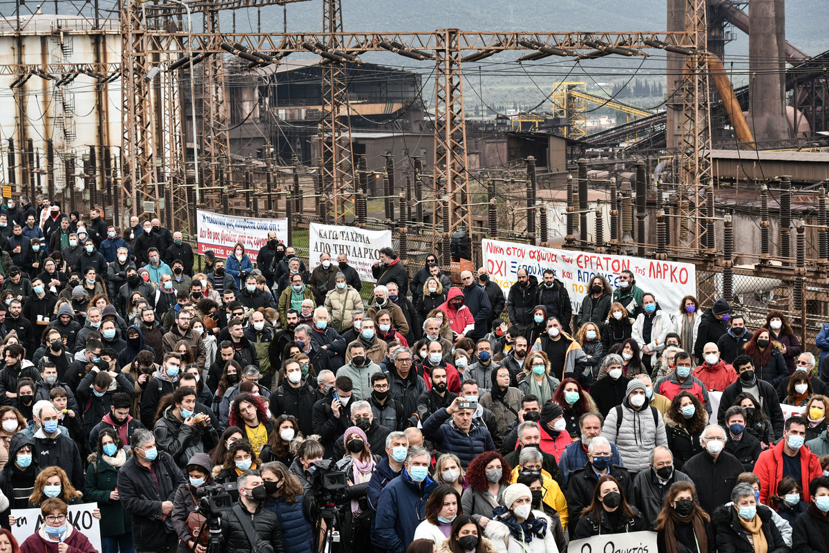 Μέλη του ΠΑΜΕ πραγματοποίησαν συγκέντρωση διαμαρτυρίας στις εγκαταστάσεις της εταιρείας ΛΑΡΚΟ στη Λάρυμνα Φθιώτιδας, την Κυριακή 13 Φεβρουαρίου 2022, διεκδικώντας τη διασφάλιση συνέχισης της λειτουργίας του εργοστασίου και των θέσεων εργασίας. ΑΠΕ-ΜΠΕ/ΚΚΕ/GEORGE KARAGIANNIS