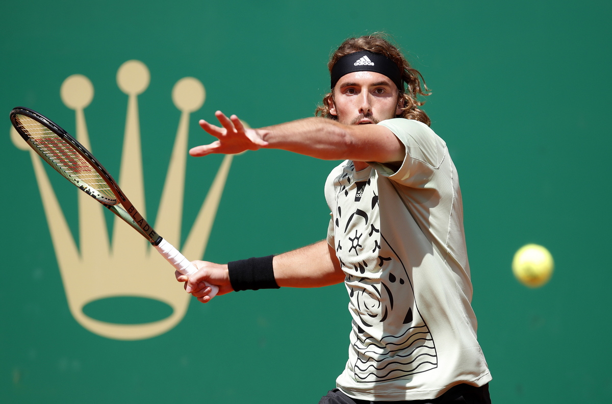 epa09889674 Stefanos Tsitsipas of Greece returns the ball to Laslo Djere of Serbia during their third round match at the Monte-Carlo Rolex Masters tournament in Roquebrune Cap Martin, France, 14 April 2022. EPA/SEBASTIEN NOGIER