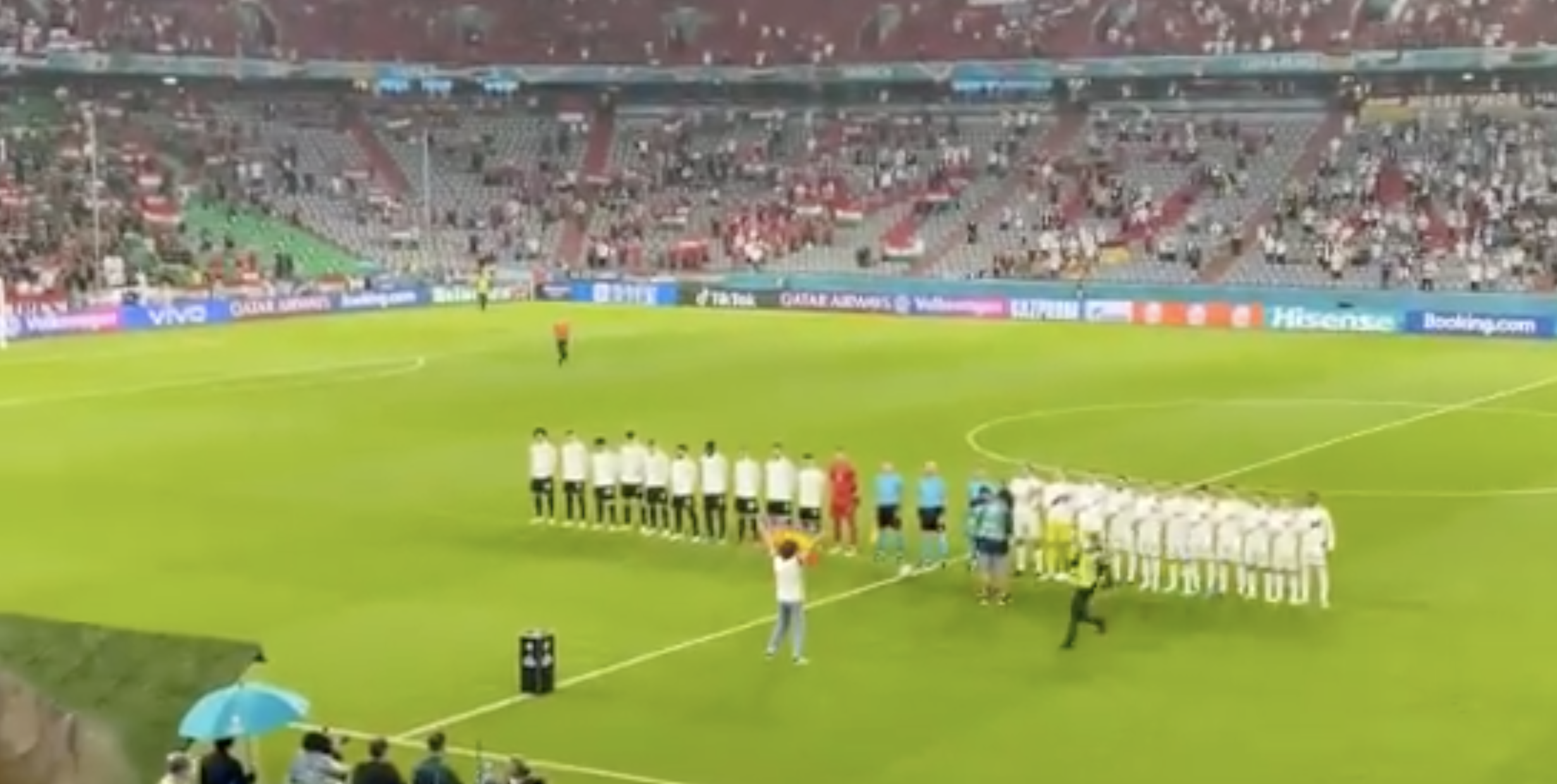 Το σίριαλ που προκάλεσε η άρνηση της UEFA στο Μόναχο για τη φωταγώγηση της «Allianz Arena» στα χρώματα του Pride είχε και νέο επεισόδιο. Κατά την ανάκρουση του εθνικού ύμνου της Ουγγαρίας πριν από το ματς με τη Γερμανία, ένας οπαδός κατάφερε να εισβάλει στον αγωνιστικό χώρο, θέλοντας να δείξει τη σημαία της ΛΟΑΤΚΙ κοινότητας μπροστά στους ποδοσφαιριστές. Κάτι που τελικά κατάφερε, πριν οι φρουροί του γηπέδου τον ακινητοποιήσουν και τον απομακρύνουν για την έναρξη του ματς.
