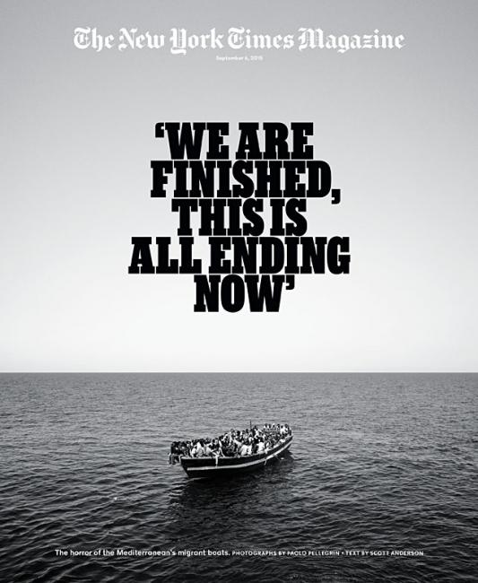 Αυτό είναι το εξώφυλλο του νέου τεύχους του New York Times Magazine, που κάνει ειδικό αφιέρωμα στο προσφυγικό ζήτημα και τους ανθρώπους που θέτουν τη ζωή τους κάθε μέρα σε κίνδυνο, με σκοπό να γλιτώσουν από τις φρικιαστικές πολεμικές συγκρούσεις που λαμβάνουν χώρα στη Μέση Ανατολή.