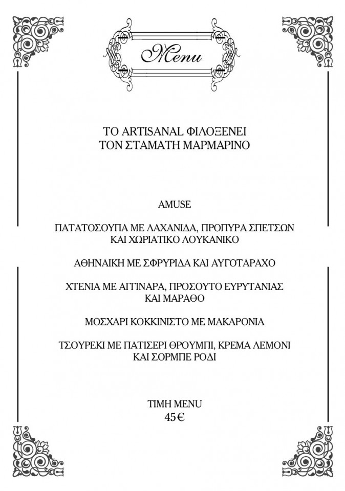 Ο chef του Artisanal Δημήτρης Δημητριάδης έχει την επιμέλεια και προτείνει 4 διαφορετικούς Έλληνες συνάδελφους και φίλους chefs, με έντονη παρουσία στην δημιουργική Ελληνική κουζίνα, οι οποίοι θα δημιουργήσουν το δικό τους προσωπικό μενού την Δευτέρα που τους αντιστοιχεί στο “Artisanal”.