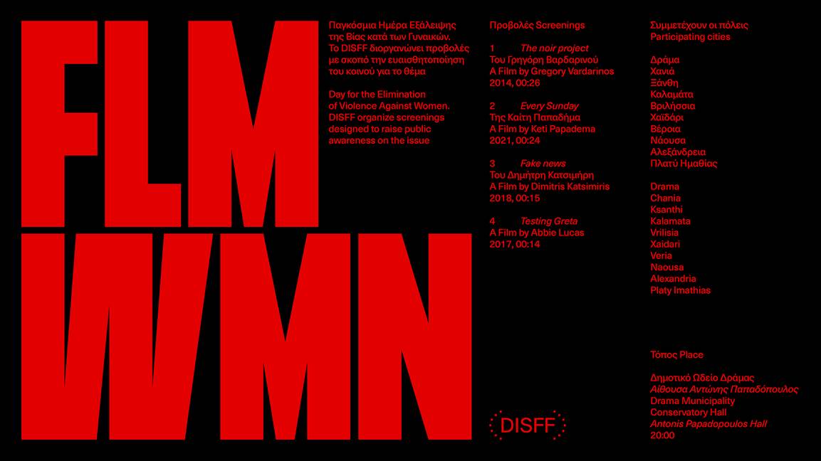 Το Διεθνές Φεστιβάλ Ταινιών Μικρού Μήκους Δράμας, εκφράζοντας την ευαισθησία του απέναντι στο πρόβλημα της έμφυλης βίας, στις 22-28 Νοεμβρίου διοργανώνει σειρά προβολών με τίτλο ΤΟ ΦΕΣΤΙΒΑΛ ΔΡΑΜΑΣ για την Παγκόσμια Ημέρα Εξάλειψης της Βίας εναντίον των Γυναικών.