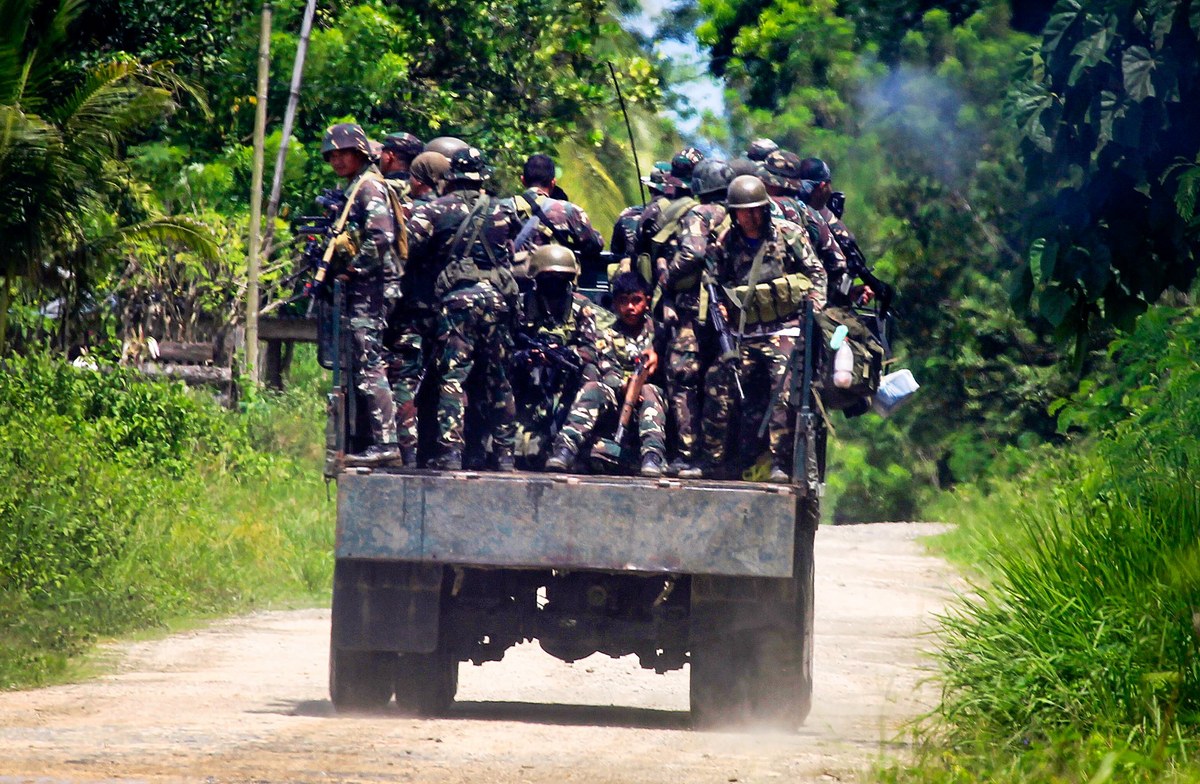 epa06041039 Filipino soldiers onboard a truck in Pigcawayan, North Cotabato, Mindanao Island, southern Philippines, 21 June 2017. According to media reports, Members of the Bangsamoro Islamic Freedom Fighters (BIFF) attacked a school at a town in North Cotabato taking five hostages. According to Armed Forces spokesman Restituto Padilla, the BIFF have withdrawn their men and around 100 families have been evacuated. EPA/MARK NAVALES