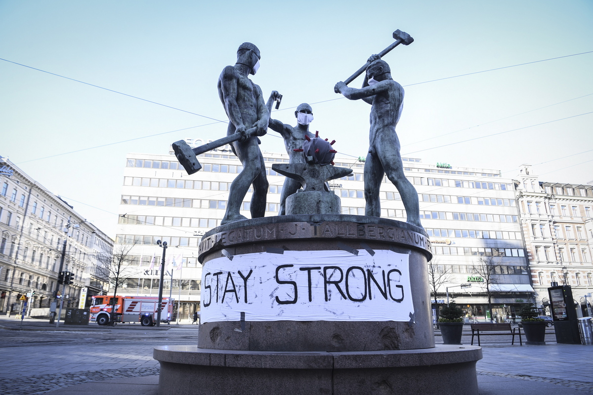 epa08334291 A banner at the Three Smiths Statue reads 'Stay Strong' in Helsinki, Finland, 31 March 2020. According to the Johns Hopkins University, Finland has registered at least 1,418 COVID-19 cases, the disease caused by the novel coronavirus SARS-CoV-2. EPA/KIMMO BRANDT
