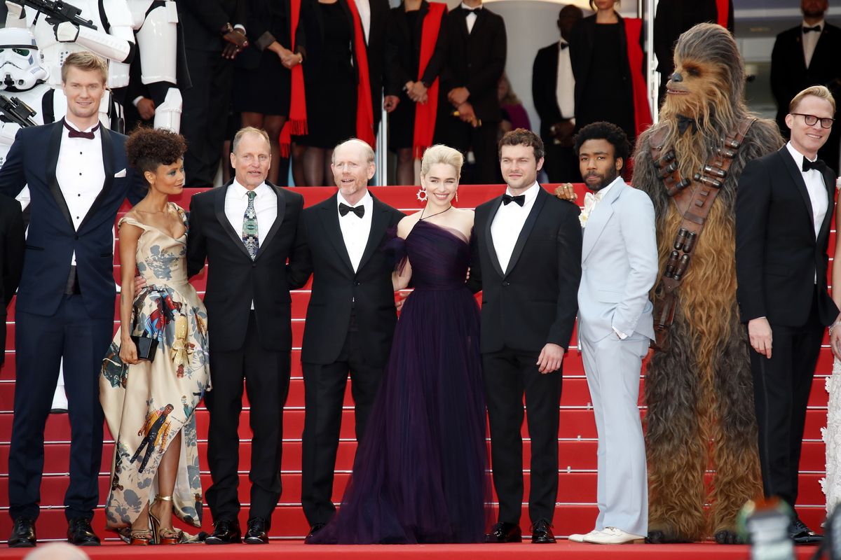 epa06739577 (L-R) Joonnas Suotamo, Thandie Newton, Woody Harrelson, Ron Howard, Emilia Clarke, Alden Ehrenreich, Donald Glover, Chewbacca and Paul Bettany arrive for the screening of 'Solo: A Star Wars Story' during the 71st annual Cannes Film Festival, in Cannes, France, 15 May 2018. The movie is presented in the Official Competition of the festival which runs from 08 to 19 May. EPA/FRANCK ROBICHON