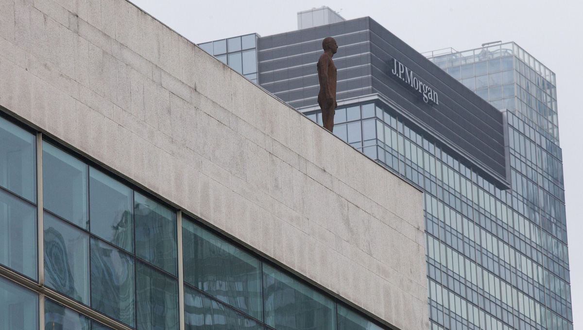 epa05022781 A sculpture of a lone figure by British artist Antony Gormley stands on a rooftop ledge of a building in Hong Kong's financial district, Central, Hong Kong, China, 13 November 2015. The installation by Antony Gormley is called Event Horizon and is a privately-funded public art project consisting of 31 sculptures, 27 made of fibre glass mounted on rooftops, with four made of cast iron at ground level. According to the Hong Kong Police, several emergency phone calls were placed to them today by anxious members of the public who witnessed what they thought was someone about to jump off a building, a popular way of committing suicide in Hong Kong. Last year, Hongkong Land reportedly withdrew sponsorship for the exhibition following objections from J.P. Morgan after one of the US investment bank’s Hong Kong employees plunged to his death from a Hongkong Land building in Central. EPA/ALEX HOFFORD