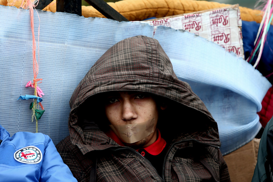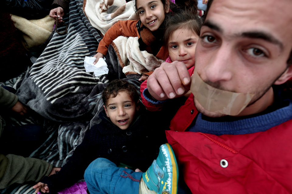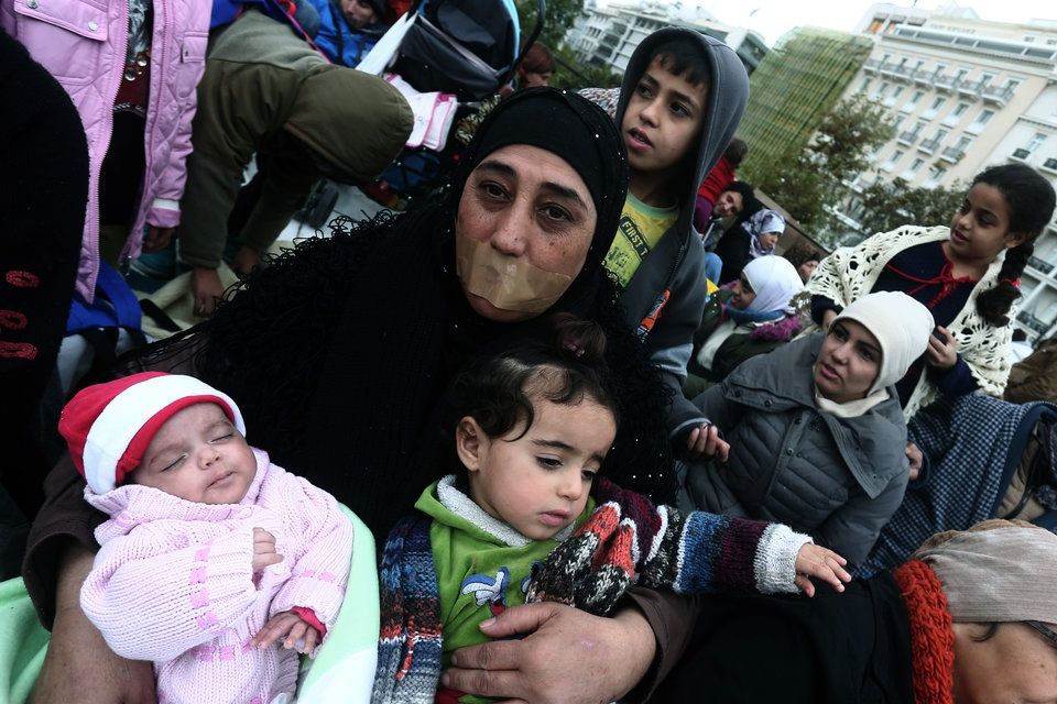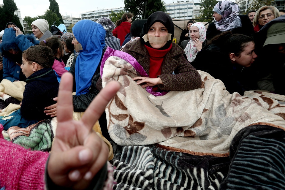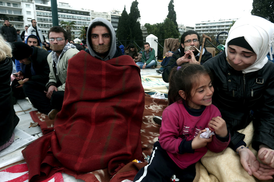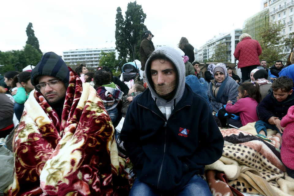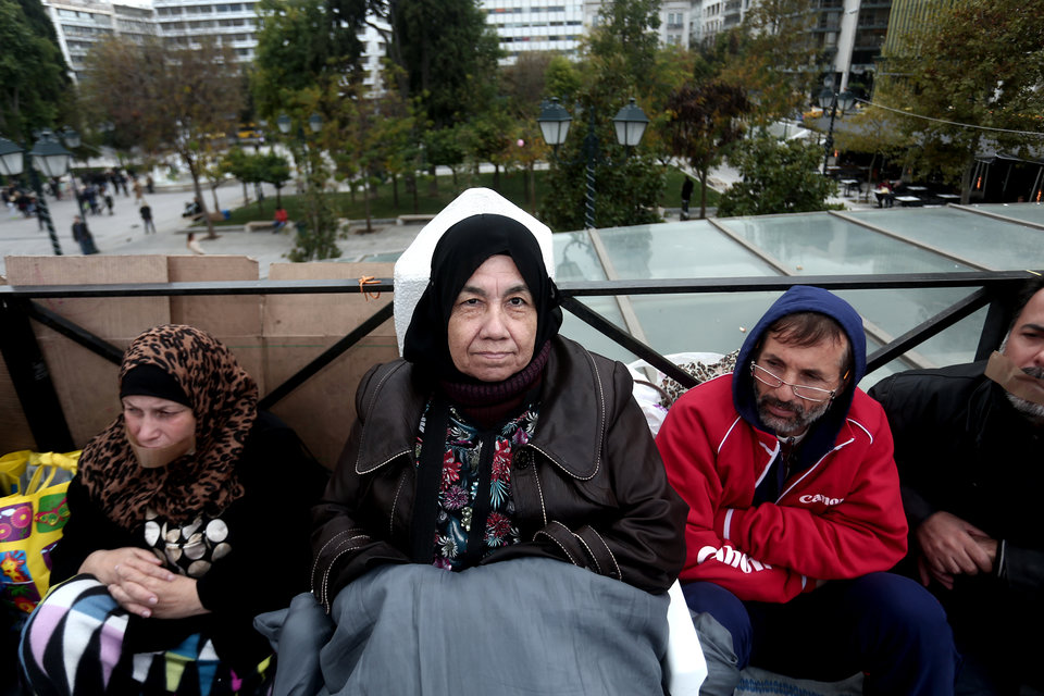 Το πλήθος προσφύγων από τη Συρία, που βρίσκεται για έκτη ημέρα στην πλατεία Συντάγματος, κάνοντας απεργία πείνας ζητώντας άσυλο και στέγη. Οι διαμαρτυρόμενοι έκλεισαν τα στόματά τους με μονωτική ταινία, συμβολοποιώντας την έναρξη της απεργίας πείνας, ενώ επιθυμούν παράλληλα και πλήρη ιατροφαρμακευτική περίθαλψη, καθώς αρκετά μέλη της αντιμετωπίζουν προβλήματα υγείας.