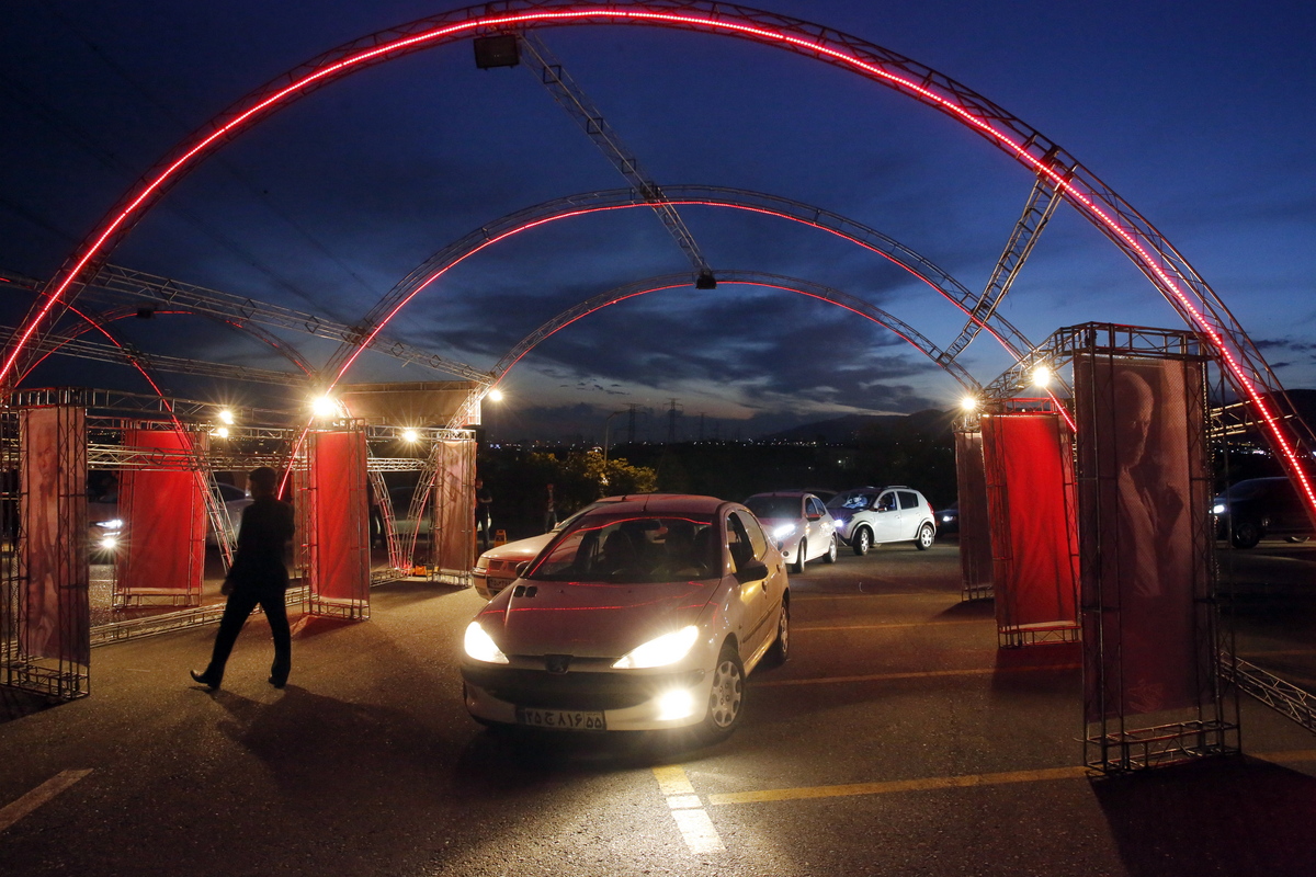 epa08396527 Iranians arrive for drive-in cinema at the Milad Tower complex in Tehran, Iran, 01 April 2020. Media reported for the first time after Iranian 1979 revolution Iran holds drive-in cinema in order to limit the spread of the SARS-CoV-2 coronavirus which causes the Covid-19 disease. Iran is one of the most affected countries by the COVID-19 disease where more than 6,000 people have died. EPA/ABEDIN TAHERKENAREH