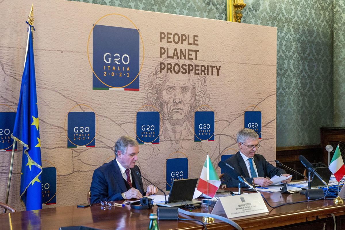 epa09038903 A handout photo made available by G20 Italy Finance Media shows Italian Economy Minister Daniele Franco (R) with the Governor of the Bank of Italy, Ignazio Visco (L), attend a press conference of the meeting of Finance ministers and central bank governors of the G20 countries, Rome, Italy, 26 February 2021. EPA/PRESS CONFERENCE G20 ITALY FINANCE MEDIA / HANDOUT HANDOUT EDITORIAL USE ONLY/NO SALES