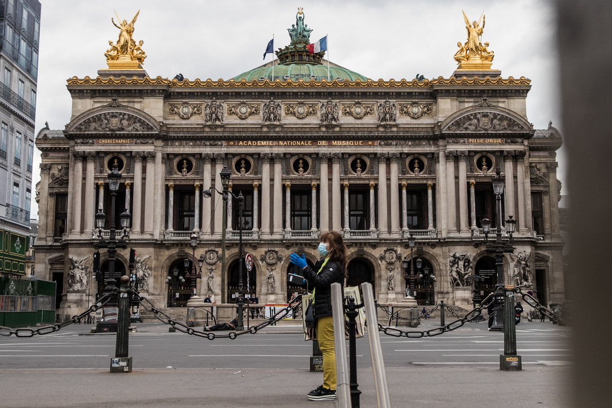 epa08401581 A woman with protection mask walks next to Palais Garnier in the 9th arrondissement in Paris, France, 04 May 2020. France is currently under lockdown in an attempt to stop the widespread of the SARS-CoV-2 coronavirus causing the Covid-19 disease, but the French government plans to loosen containment measures and traffic restrictions from 11 May although some social distancing measures will still be kept in place. EPA/MOHAMMED BADRA