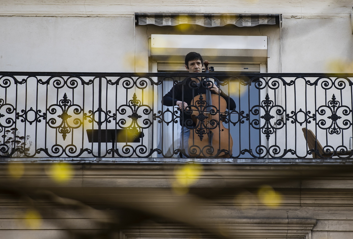 epa08328510 A musician plays the cello on his balcony in central Paris, France, 28 March 2020. France is under lockdown in an attempt to stop the widespread of the SARS-CoV-2 coronavirus causing the Covid-19 disease. EPA/IAN LANGSDON