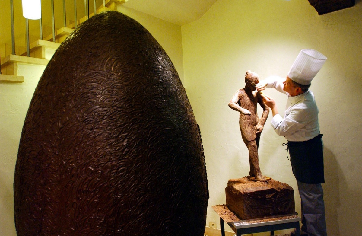 epa00156580 A chef adjusts a chocolate-made statue besides a huge egg, a few hours before the opening of Brugge's "Chocolademuseum" (Chocolate museum), Friday, 19 March 2004. EPA/LIEVEN VAN ASSCHE
