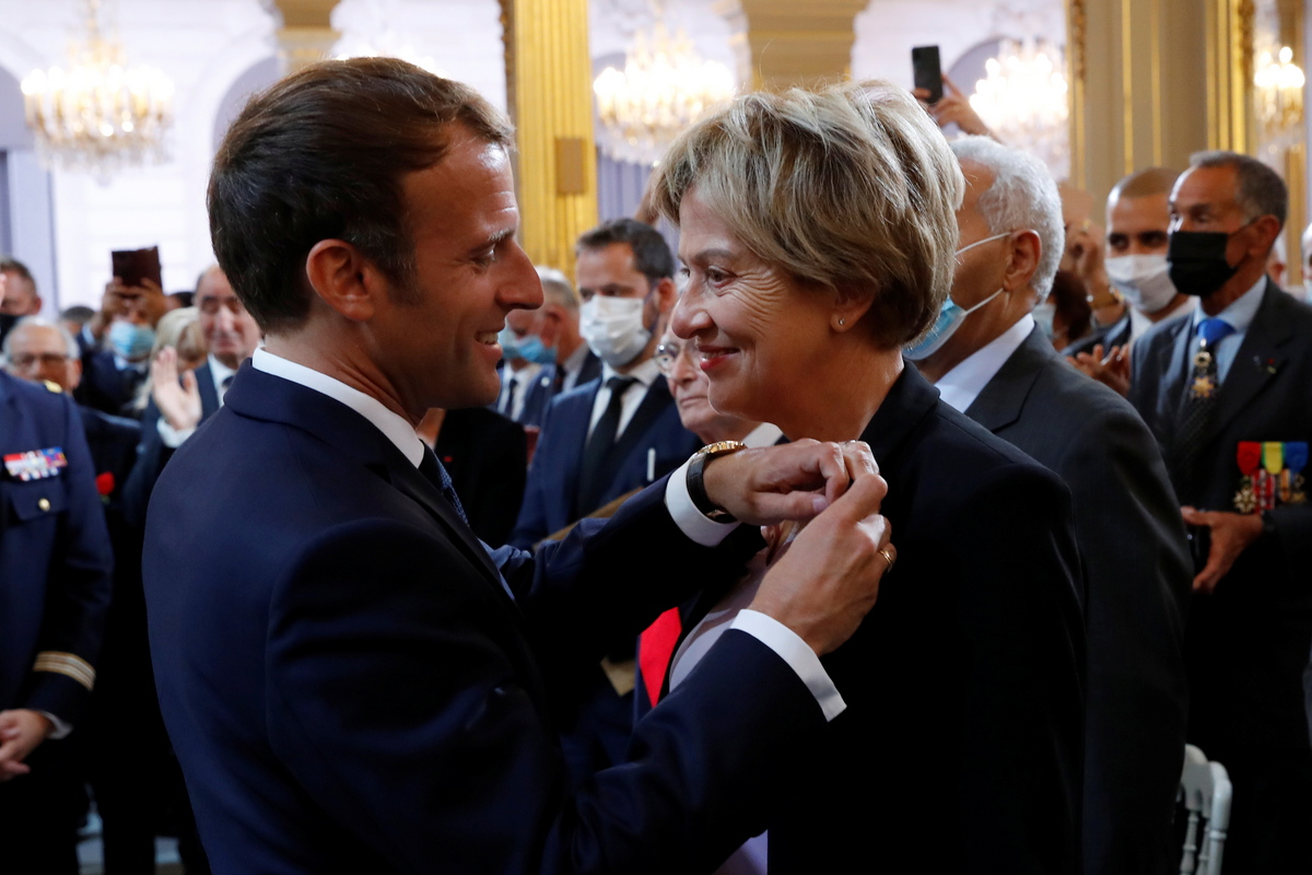 epa09477599 Bornia Tarall is awarded with the 'Chevalier de l'Ordre National du Merite' by French President Emmanuel Macron during a ceremony in memory of the Harkis, Algerians who helped the French Army in the Algerian War of Independence, at the Elysee Palace in Paris, France, 20 September 2021. EPA/GONZALO FUENTES / POOL MAXPPP OUT