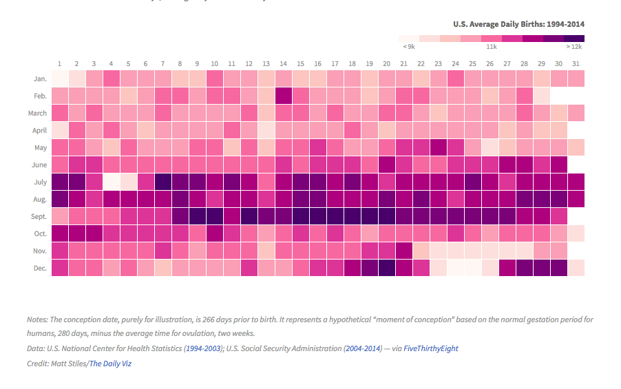 Μπαίνουμε σχεδόν στην εποχή που γεννιούνται τα περισσότερα μωρά. Ο Σεπτέμβριος είναι ο πιο γεμάτος μήνας με εγκυμοσύνες, αλλά οι αριθμοί ξεκινούν από τώρα να ανεβαίνουν προς τα πάνω, όπως δείχνει το παρακάτω γράφημα από την Daily Viz: