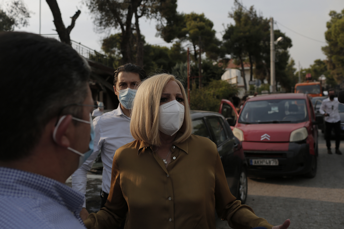 Η πρόεδρος του ΚΙΝ.ΑΛ Φώφη Γεννηματά συνομιλεί με πολίτες κατά την διάρκεια της επίσκεψης στην Βαρυμπόμπη που επλήγη από την χθεσινή πυρκαγιά, την Τετάρτη 4 Αυγούστου 2021. ΑΠΕ-ΜΠΕ/ΑΠΕ-ΜΠΕ/ΚΩΣΤΑΣ ΤΣΙΡΩΝΗΣ