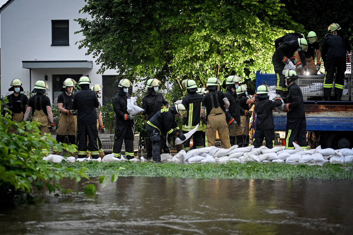 epa09344872 Firefighters and the technical relief organization move sandbags against the rising water level of the Duessel, which has already flooded large parts and streets, in Duesseldorf Grafenberg, Germany, 14 July 2021. Large parts of North Rhine-Westphalia were hit by heavy, continuous rain in the night to 14 July. According to the German Weather Service (DWD), the rain is not expected to let up until 15 July. The Rhine level has risen significantly in recent days. EPA/SASCHA STEINBACH