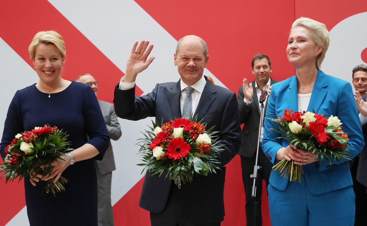 epa09490849 Top candidate of the German Social Democratic Party (SPD) Olaf Scholz (C), leading candidates of the SPD in Berlin Franziska Giffey, (L) and in Mecklenburg-Western Pomerania, Manuela Schwesig (R,) pose with flowers following a statement to the media in the aftermath of the German general elections, in Berlin, Germany, 27 September 2021. According to preliminary results, the SPD won the federal elections on 26 September by a small margin over Armin Laschet’s CDU. EPA/FOCKE STRANGMANN
