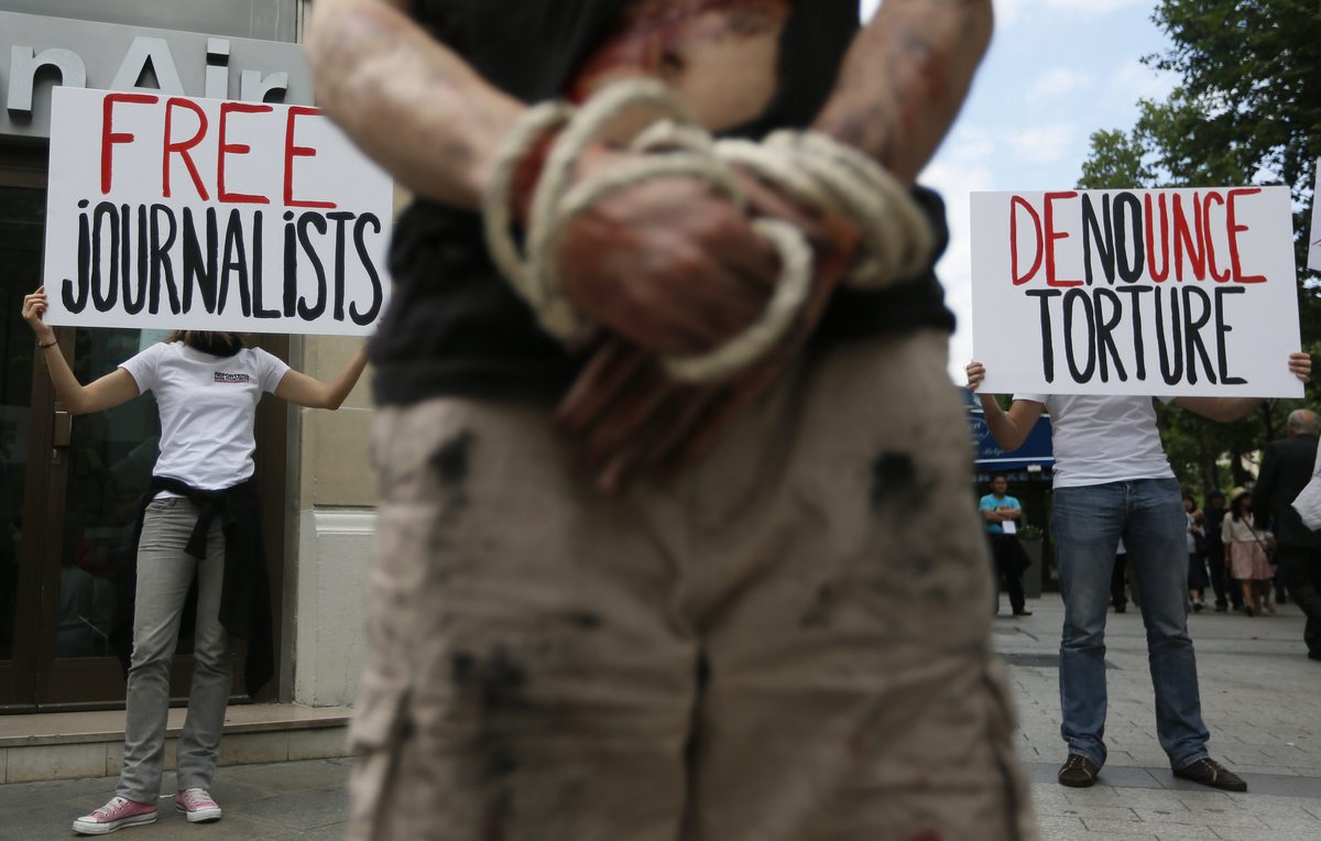 epa03302772 Activists from Reporters Without Borders (RSF), seen with hand tied and mock injuries symbolizing the fate of imprisoned journalists and bloggers by the Iranian authorities in Iran, as they call for their immediate release during a protest staged in front of Air Iran office on the Champs Elysee in Paris, France, 10 July 2012. EPA/IAN LANGSDON