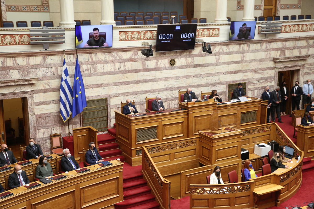 O Ðñüåäñïò ôçò Ïõêñáíßáò Volodymyr Zelensky (Âïëïíôßìéñ ÆåëÝíóêé) ìéëÜ ìÝóù ôçëåäéÜóêåøçò óå åéäéêÞ óõíåäñßáóç ôçò ÂïõëÞò, ÐÝìðôç 07 Áðñéëßïõ 2022. ÁÐÅ-ÌÐÅ/ÁÐÅ-ÌÐÅ/ÏÑÅÓÔÇÓ ÐÁÍÁÃÉÙÔÏÕ