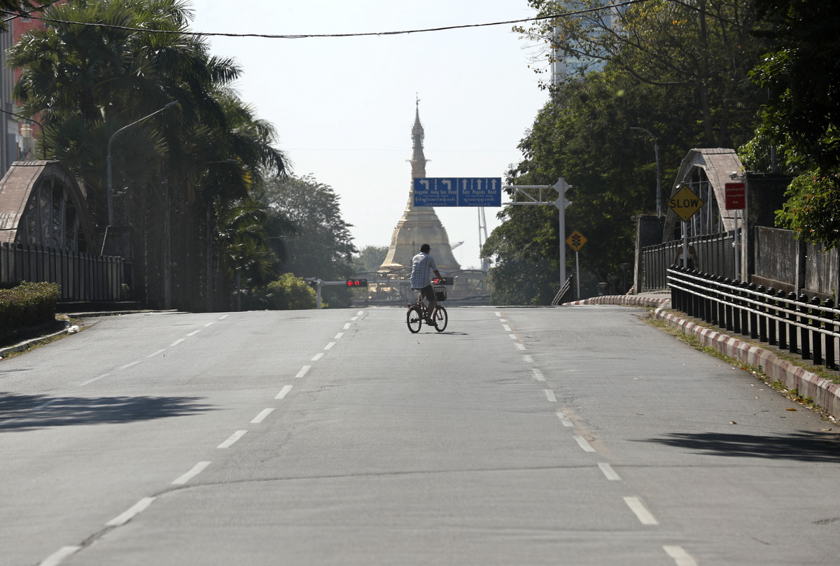 epa09633404 A man rides a bicycle on the empty road in downtown Yangon, Myanmar, 10 December 2021. Anti-coup groups call for the public to participate the Silent Strike to protest against the military coup, by staying at home and to shut down businesses from 10 am to 4 pm on 10 December 2021. EPA/STRINGER