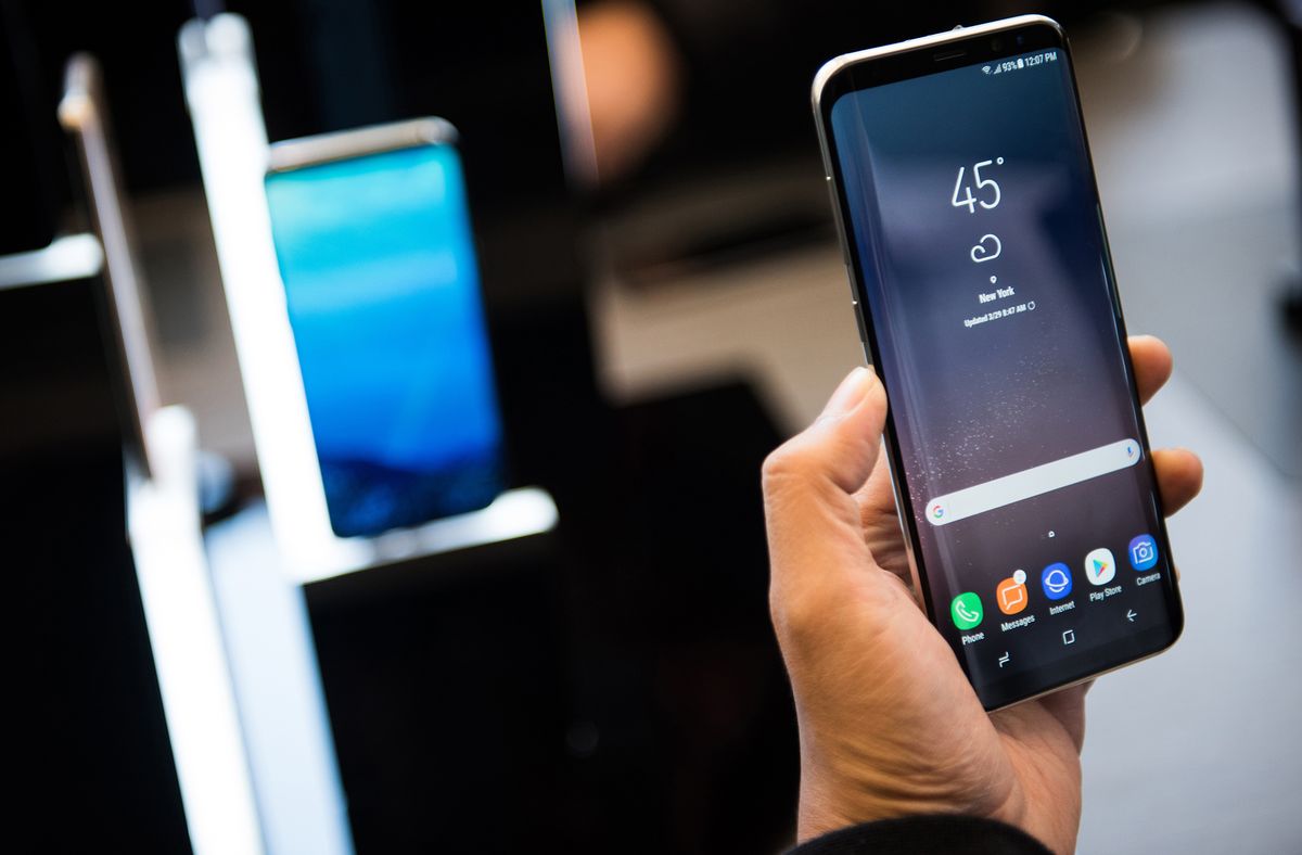 An attendee views the Samsung Electronics Co. Galaxy S8 smartphone displayed during the Samsung Unpacked product launch event in New York, U.S., on Wednesday, March 29, 2017. Samsung Electronics Co. packed the Galaxy S8 smartphone with a plethora of new features: taller, curved screens, encrypted facial recognition, deeper display colors, system-wide voice control and the ability to turn into a desktop computer. Photographer: Mark Kauzlarich/Bloomberg