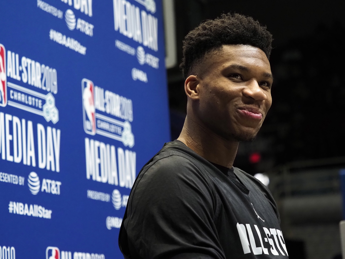 epa07375504 Milwaukee Bucks Giannis Antetokounmpo of Greece reacts to a question at Media Day during the All Star Weekend at the Bojangles' Coliseum in Charlotte, North Carolina, USA, 16 February 2019. EPA/JOHN G. MABANGLO SHUTTERSTOCK OUT SHUTTERSTOCK OUT SHUTTERSTOCK OUT