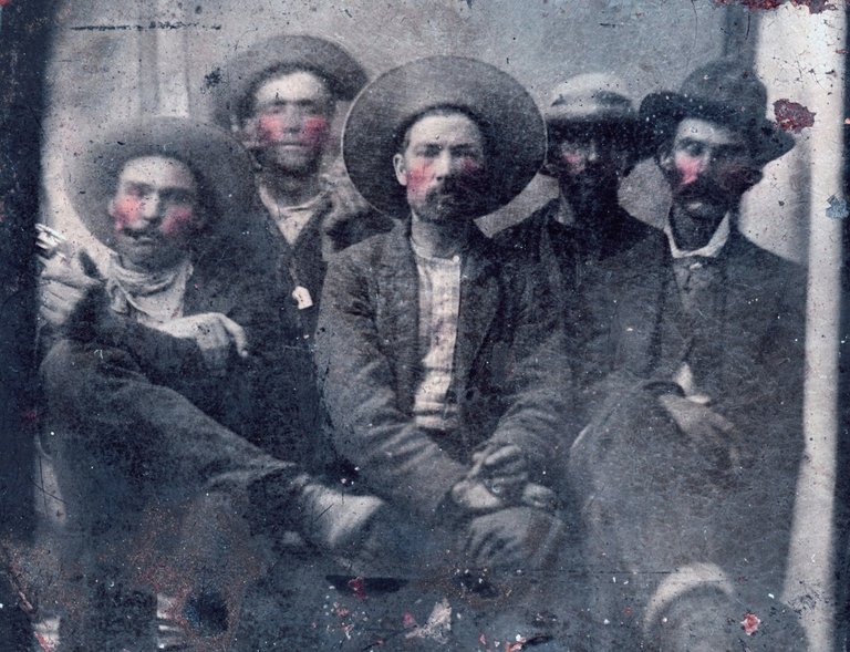 Στην φωτογραφία, η οποία τραβήχτηκε κάπου στα τέλη του 19ου αιώνα, φαίνεται μια παρέα αντρών, μέλος της οποίας ήταν και ο Μπίλυ δε Κίντ, ένας εκ των πιο διαβόητων εγκληματιών στην αμερικανική ιστορία. Το συγκλονιστικό της φωτογραφίας όμως, είναι ότι στην ίδια παρέα βρίσκεται και ο μετέπειτα σερίφης Πατ Γκάρρετ, που είναι εκείνος που κατάφερε τελικά να σκοτώσει τον Μπίλυ δε Κίντ και αυτό είναι που κάνει την φωτογραφία αυτή τόσο σπάνια και ξεχωριστή.