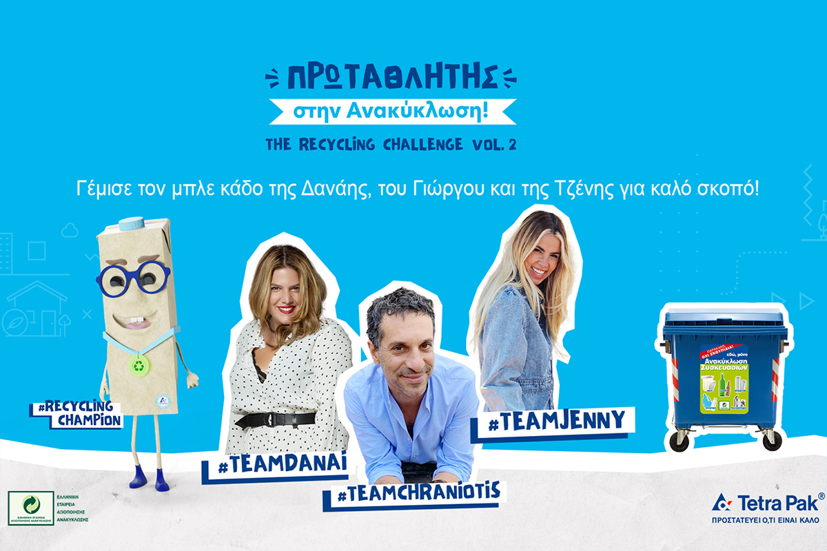 O Recycling Champion της Tetra Pak επιστρέφει και προκαλεί τρία αγαπημένα μας πρόσωπα και εμάς να κάνουμε μία σωστή επιλογή για το περιβάλλον και να γίνουμε «Πρωταθλητές στην Ανακύκλωση», ανακυκλώνοντας τις χάρτινες συσκευασίες Tetra Pak στον μπλε κάδο για καλό σκοπό!