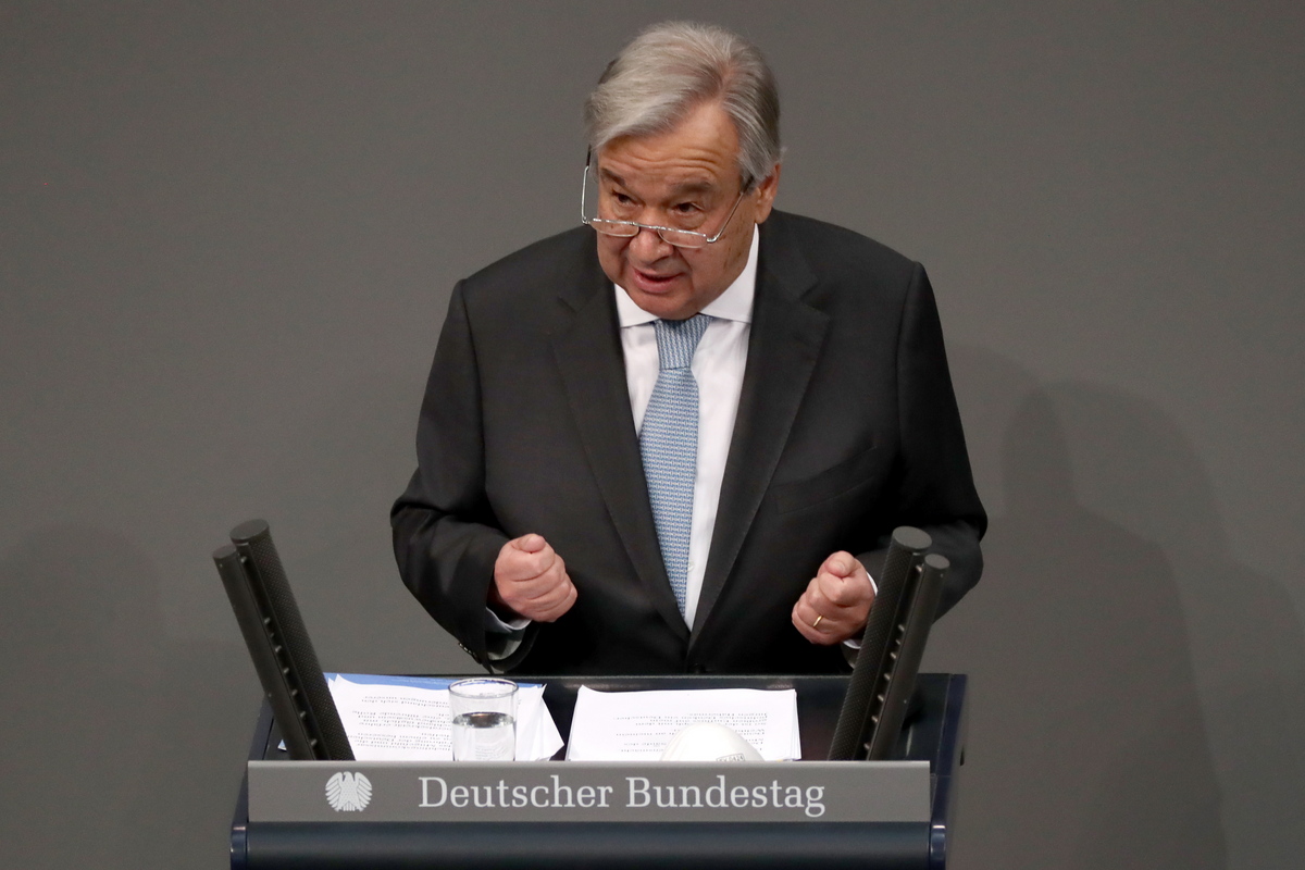 epa08891274 UN Secretary-General Antonio Guterres delivers a speech at the German parliament 'Bundestag' in Berlin, Germany, 18 December 2020. EPA/HAYOUNG JEON
