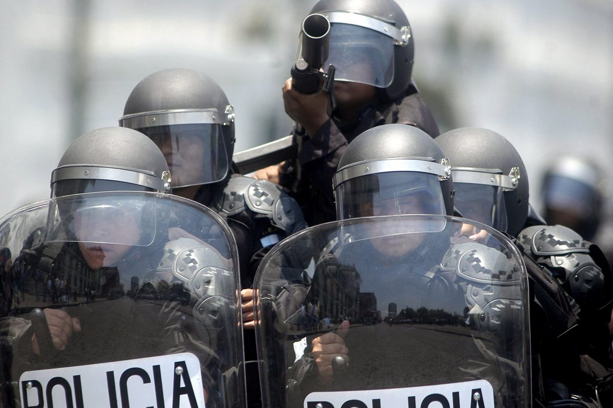 epa00694397 Guatemalan special force agents of the National Police stage an exercise testing their new anti-riot gear on Wednesday 19 April, 2006 at the Constitution Square, in Guatemala city. EPA/Ulises Rodriguez