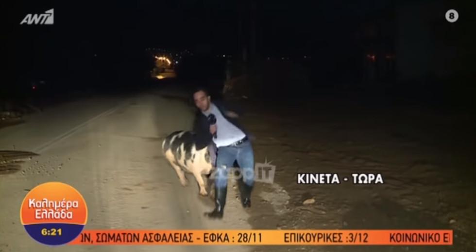 Πρωταγωνίστρια του περιστατικού μία γουρούνα η οποία άρχισε να κυνηγάει τον ρεπόρτερ του καναλιού, ενώ σε κάποιο σημείο φαίνεται να τον δαγκώνει.