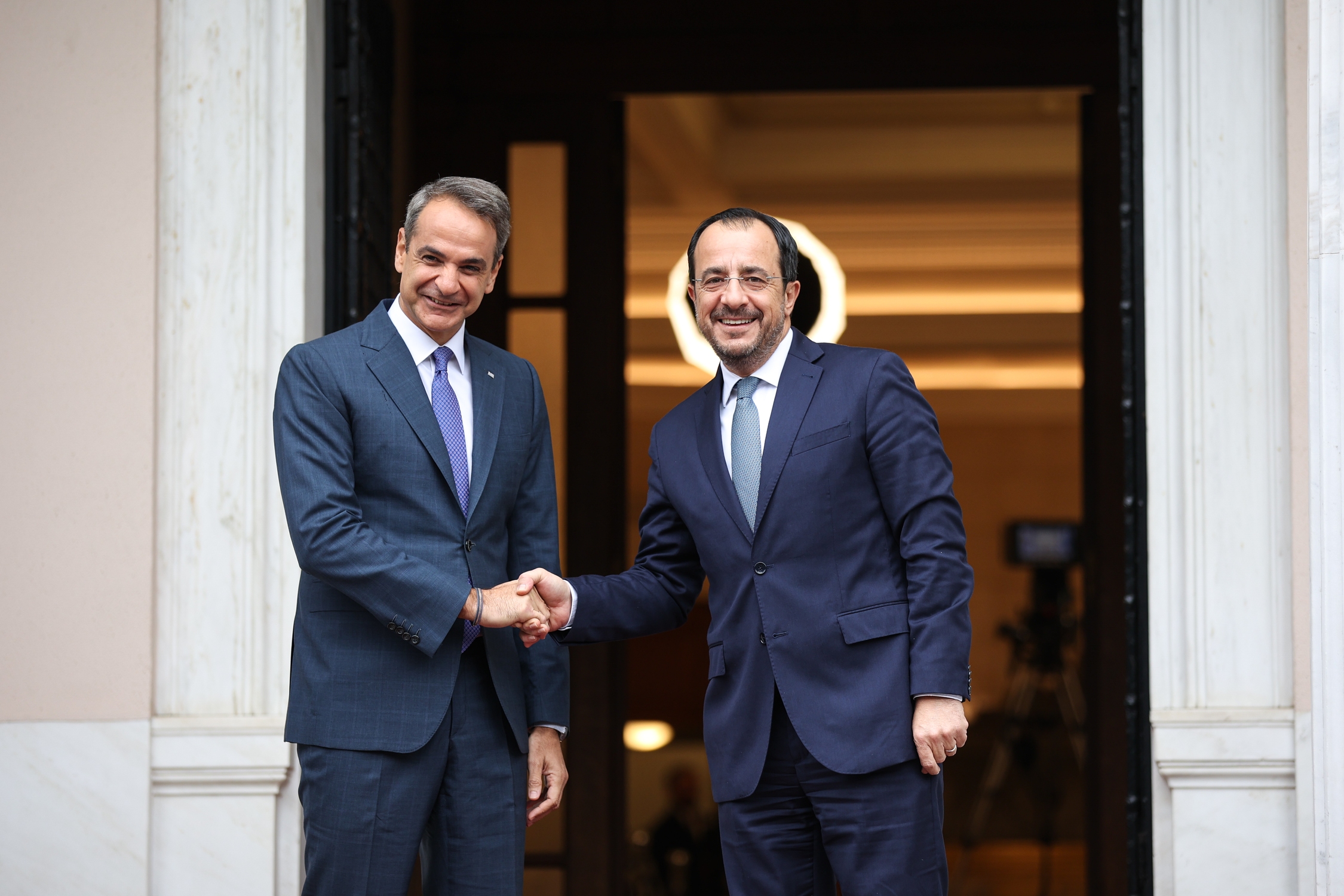 Greek Prime Minister Kyriakos Mitsotakis welcomes the President of the Republic of Cyprus, Nikos Christodoulides for the meeting of the Greece-Cyprus Supreme Council at the Maximos Mansion in Athens, Greece on November 10, 2023. / Ο Έλληνας πρωθυπουργός Κυριάκος Μητσοτάκης υποδέχεται τον πρόεδρο της Κυπριακής Δημοκρατίας, Νίκο Χρηστοδουλίδη για την συνεδρίαση του Ανώτατου Συμβούλιου Ελλάδας-Κύπρου στο Μέγαρο Μαξίμου, Αθήνα, 10 Νοεμβρίου 2023.