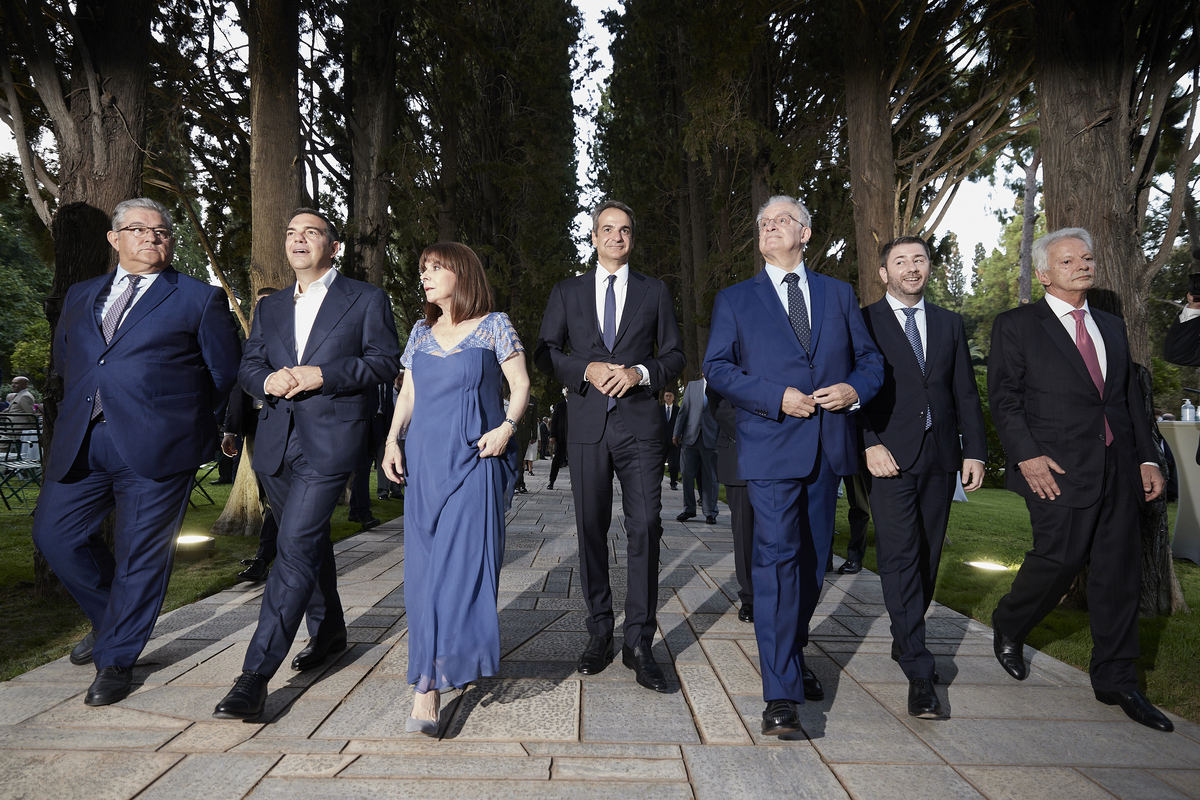 Ο πρόεδρος του ΣΥΡΙΖΑ Αλέξης Τσίπρας(Κ) μαζί με τους πολιτικούς αρχηγούς παρακολουθεί την ομιλία της Προέδρου της Δημοκρατίας Κατερίνα Σακελλαροπούλου, στη δεξίωση για την 48η επέτειο αποκατάστασης της Δημοκρατίας στη χώρα μας, στο Προεδρικό Μέγαρο, Αθήνα, Κυριακή 24 Ιουλίου 2022. ΑΠΕ-ΜΠΕ/ΓΡΑΦΕΙΟ ΤΥΠΟΥ ΣΥΡΙΖΑ – ΠΡΟΟΔΕΥΤΙΚΗ ΣΥΜΜΑΧΙΑ/ΜΕΝΕΛΑΟΣ ΜΥΡΙΛΛΑΣ