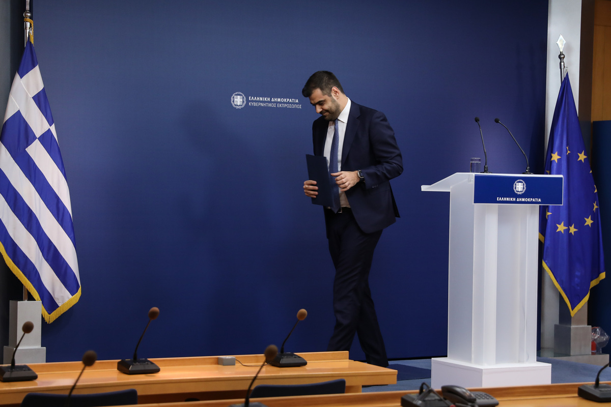 Ο υφυπουργός παρά τω πρωθυπουργώ και κυβερνητικός εκπρόσωπος, Παύλος Μαρινάκης κατεβαίνει από το βήμα μετά την ανακοίνωση της νέας σύνθεσης της κυβέρνησης στη Γενική Γραμματεία Επικοινωνίας και Ενημέρωσης, Αθήνα, Παρασκευή 14 Μαρτίου 2025. ΑΠΕ-ΜΠΕ/ΑΠΕ-ΜΠΕ/ΓΙΩΡΓΟΣ ΒΙΤΣΑΡΑΣ