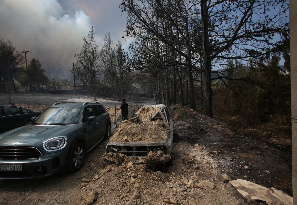 Καμένα αυτοκίνητα από την πυρκαγιά στη Αγία Παρασκευή, Τετάρτη 23 Αυγούστου 2023 Η πυρκαγιά που εκδηλώθηκε χθες στη Φυλή, όπως επισήμανε σε ενημέρωση ο εκπρόσωπος Τύπου του Πυροσβεστικού Σώματος, αντιπύραρχος Γιάννης Αρτοποιός, έχει επηρεάσει περιοχές νότια της Πάρνηθας στην ευρύτερη περιοχή της Ντάρδιζας αλλά και δυτικά, πλησίον των περιοχών Αγία Παρασκευή και Αμυγδαλέζα. Επιχειρούν 202 πυροσβέστες με 9 ομάδες πεζοπόρων τμημάτων, 65 οχήματα και για την αεροπυρόσβεση έχουν διατεθεί 7 αεροσκάφη εκ των οποίων 2 από Σουηδία και 2 από Γερμανία καθώς και 8 ελικόπτερα εκ των οποίων το 1 για εναέριο συντονισμό. Ταυτόχρονα επιχειρούν ισχυρές δυνάμεις εθελοντών πυροσβεστών με πεζοπόρα τμήματα, δυνάμεις που έχει διαθέσει το Γενικό Επιτελείο Εθνικής 'Αμυνας, η Ελληνική Αστυνομία, καθώς και υδροφόρες και μηχανήματα έργου της Περιφέρειας Αττικής. ΑΠΕ-ΜΠΕ/ΑΠΕ-ΜΠΕ/Αλέξανδρος Μπελτές