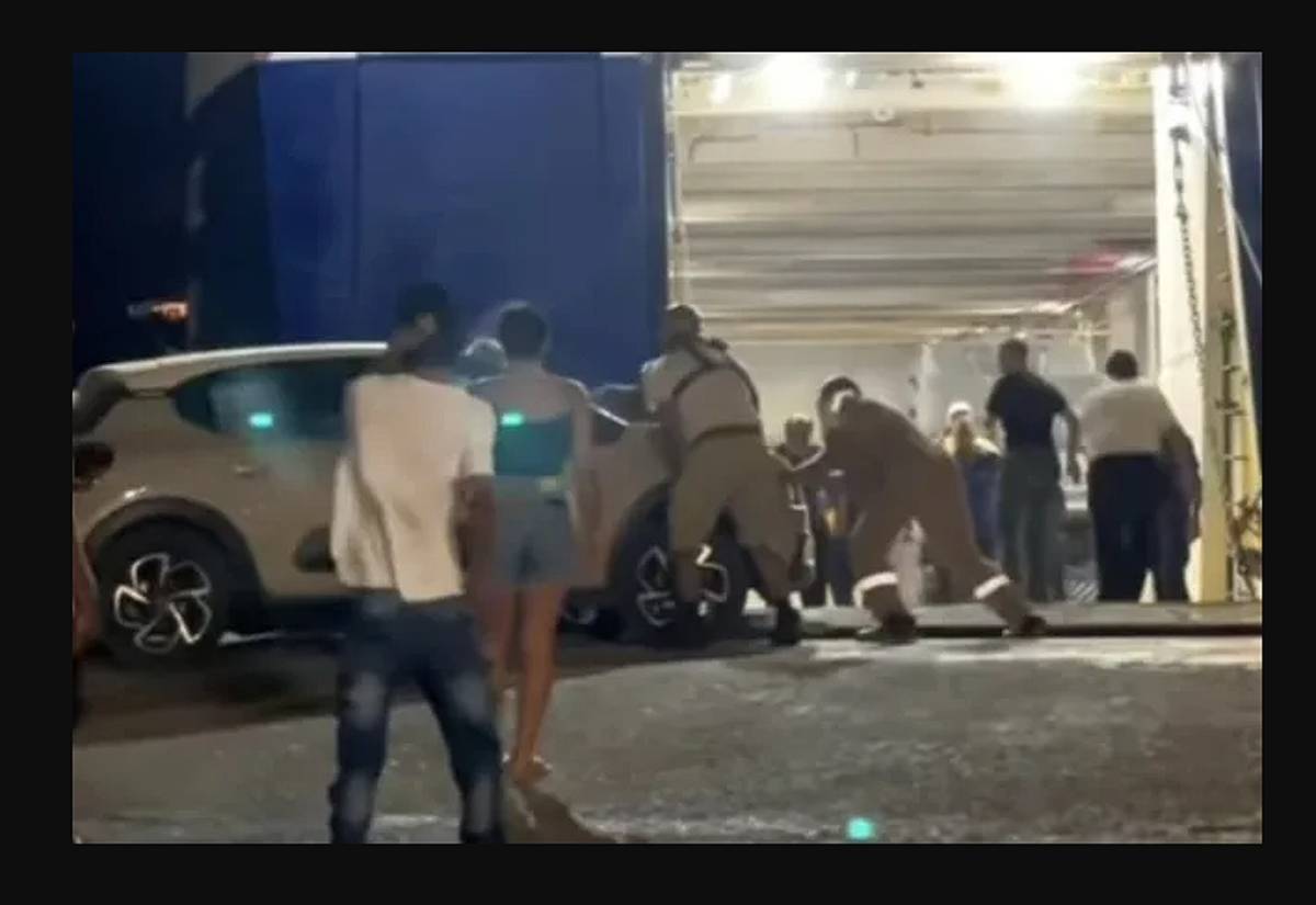 Όπως διακρίνεται, επιβάτες και μέλη του πληρώματος προσπαθούν να βοηθήσουν έναν οδηγό ΙΧ αυτοκινήτου να εισέλθει εντός του πλοίου, όμως μάταια. Κι αυτό γιατί ο καπετάνιος αποφασίζει να σηκώσει τη μπουκαπόρτα και το πλοίο να αναχωρήσει, με αποτέλεσμα το αυτοκίνητο να βρεθεί στο χείλος της προβλήτας.